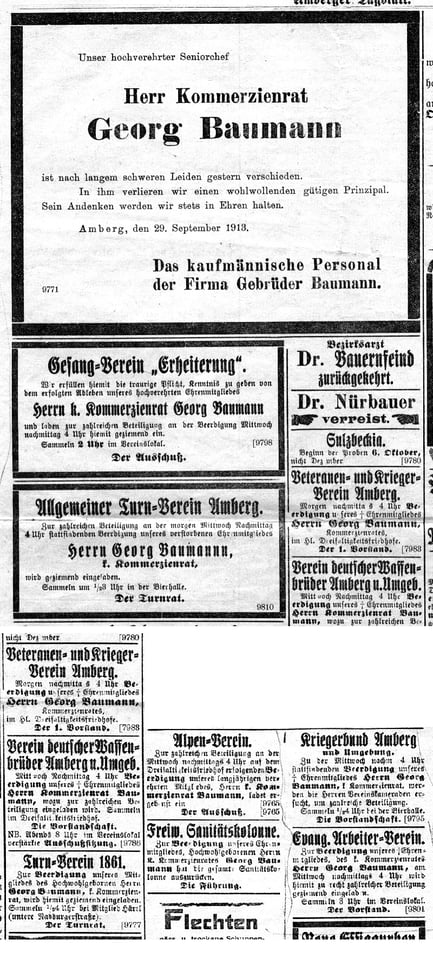 Auffällig sind die Vereine, die ihre Mitglieder zur Teilnahme an der Beerdigung aufrufen (Telefon gibt es noch nicht): Gesangsverein Erheiterung, Allgemeiner Turnverein Amberg, Veteranen- und