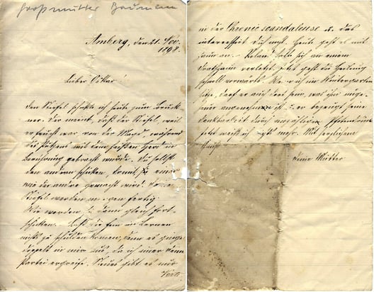 Das einzige Dokument aus der jungen Zeit ist ein Brief von 1865 (22 Jahre). Der Absender ist Erhard (der sich in Weiden niedergelassen hat), an Christian oder Johann. Wahrscheinlicher ist Christian - er war gerade 28 Jahre alt und könnte daher schon verheiratet sein, während Johann erst 20 Jahre alt war. Der Brief klingt danach, dass er keine schulische Ausbildung bekommen hat. Ich stelle mit vor, er ist bei seiner Mutter zum Gesellen ausgebildet worden und wurde danach, um Erfahrung zu sammeln, herumgeschickt.