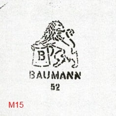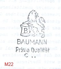 Der Markentyp mit "Baumann" unter dem Löwen war mindestens bis zum Jahre 1931 im Gebrauch. Für das Jahr 1932 konnte bisher kein Markennachweis gefunden werden, so daß entweder diese oder die nachfolgend beschriebene Marke Verwendung fand. Die häufig zusätzlich beigegebenen Großbuchstaben können nicht eindeutig interpretiert werden.