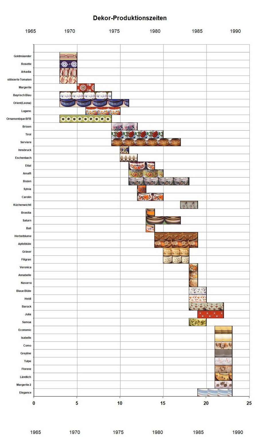 An 1968 wurde dekorierte Ware hergestellt. Anhand von Preislisten und Katalogen kann man die Dekore Jahren zuordnen. Die gut laufenden Dekore sind an längeren Produktionszeiten erkennbar. Die unglückliche Wahl der Dekore trug sicher zum wirtschaftlichen Misserfolg am Ende bei.