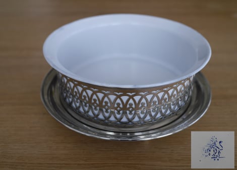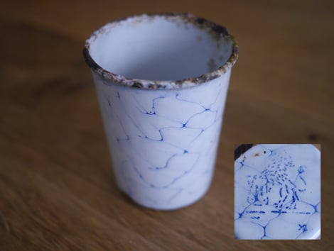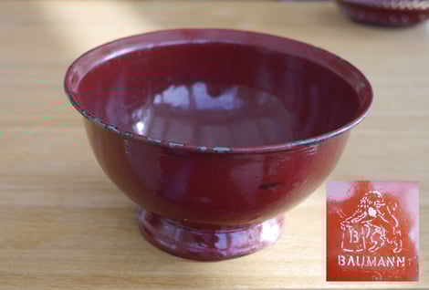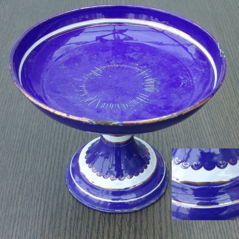 #1130 Der "Fleischständer" hat keine Marke, ist aber sicher Baumann. Im Katalog ab 1897 ist der #1130 Fleischständer 26cm (Gegenstand hat aber 24cm!) ähnlich. Gegenstand stimmt mit der Form nicht mit Katalog überein. Vielleicht war es ein Muster? Schale ist an Ständer angepunktet. Grundemail weiss, darüber kobaltblaues Email.