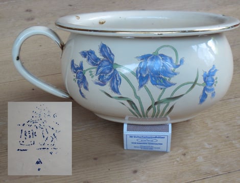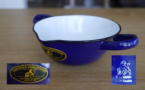 #3251/14cm Abdampfschale blau. Der Stempel wurde ab 1948 verwendet und läßt keine genauere Datumaussage zu. Die Bodenmarke ist doppelt! Anscheinend wurde die Schale repariert und nochmal blau nachemailliert und gemarkt.