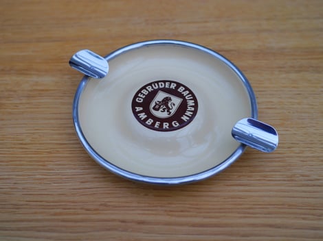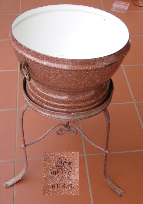 Der weiße Einsatz ist emailliert und hat die Löwen-Marke. Offensichtlich war der Einsatz eine Zulieferung für das verchromte Gestell, produziert vor 1897 (nur 2 Striche unter dem Löwen)
