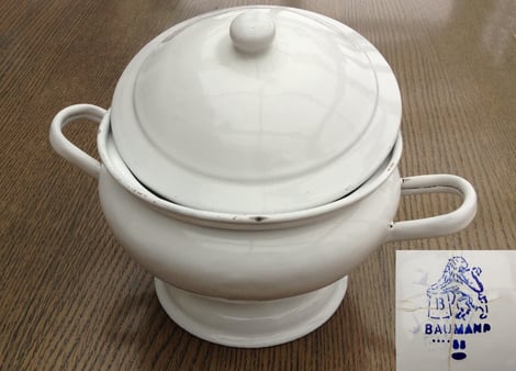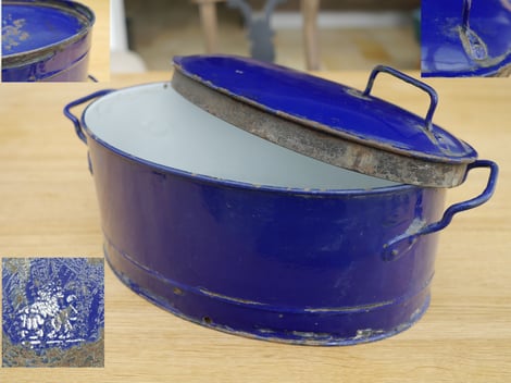 #615/34cm Ovaler Schnellbrater mit Asbest Zwischenboden (System Kuntze); 1879 hat Herr Kuntze ein Patent angemeldet. Ein dichtsitzender Deckel (daher sind die Ränder des Deckels aus dünnen Blech,nicht emailliert) und ein isolierender Boden (die Asbest einlage ist nicht mehr vorhanden) sollte das Kochgut lange warmhalten und schneller garen; ca 1900