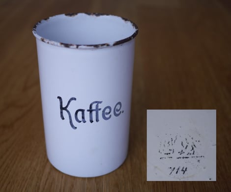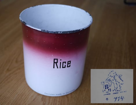 #1915/16cm "Vorratsbüchse mit Deckel" Aufschrift Rice. Der Deckel ist nicht vorhanden. Verschiedene Aufschriften waren bestellbar, zb. Anis, Bohnen, Zichorie, Erbsen, Gerste, Graupen, Gries usw..; Juli 1914.
