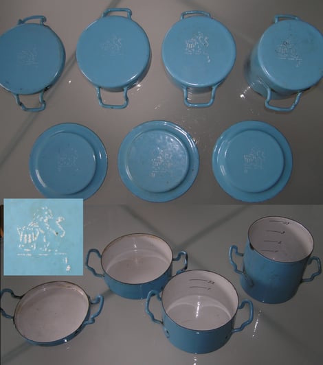 #22/8cm + #22/9cm Topf mit angeschweißten Ausguß; die Marken sind leider nicht sehr aussagekräftig! Die "34" steht für 1934 oder 1943 und der kleine Topf hat einen Stempel ohne Nummer.