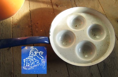 #863 "Augenpfanne (Spiegeleierpfanne) ungebördelt" mit 5 Augen und flachen Blechgriff, Die Marke 94 heisst produziert im September 1904.